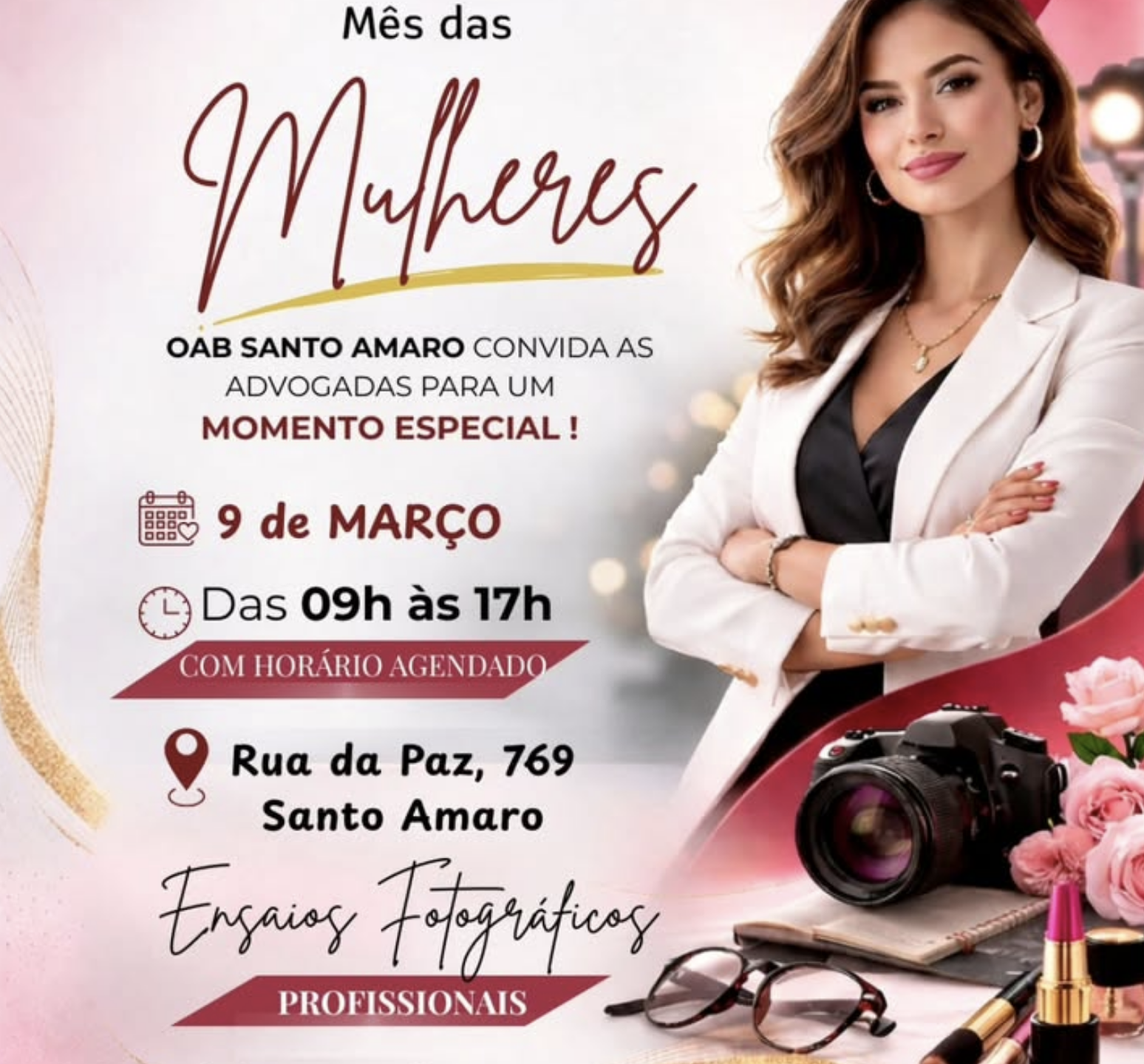 Neste Mês das Mulheres, a OAB Santo Amaro e a Comissão das Mulheres Advogadas convidam você para um momento exclusivo de valorização e autoestima: nosso Ensaio Fotográfico Profissional. 📸