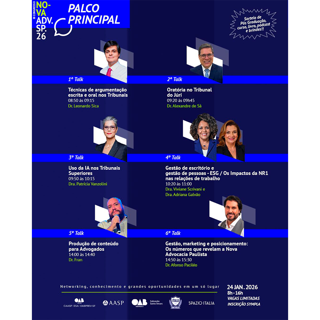 O Palco Principal reúne debates essenciais sobre atuação prática, estratégia, comunicação, tecnologia, gestão e posicionamento profissional, temas que impactam diretamente a forma como a advocacia se apresenta, se organiza e atua no cenário atual.