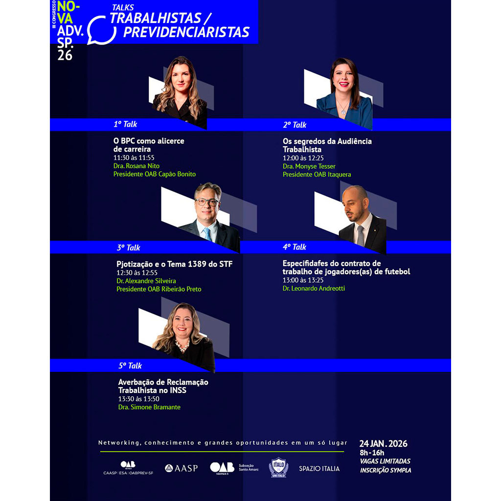 As áreas trabalhista e previdenciária estão entre as que mais impactam diretamente a vida das pessoas e exigem do advogado atualização constante, domínio técnico e visão estratégica. O Talks Trabalhistas / Previdencialistas foi pensado para discutir temas práticos, atuais e altamente relevantes para quem atua — ou deseja atuar — nessas áreas.