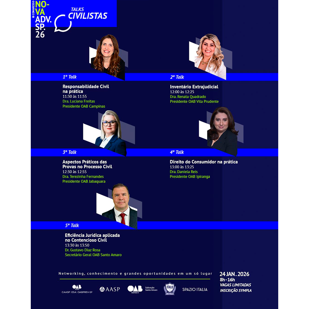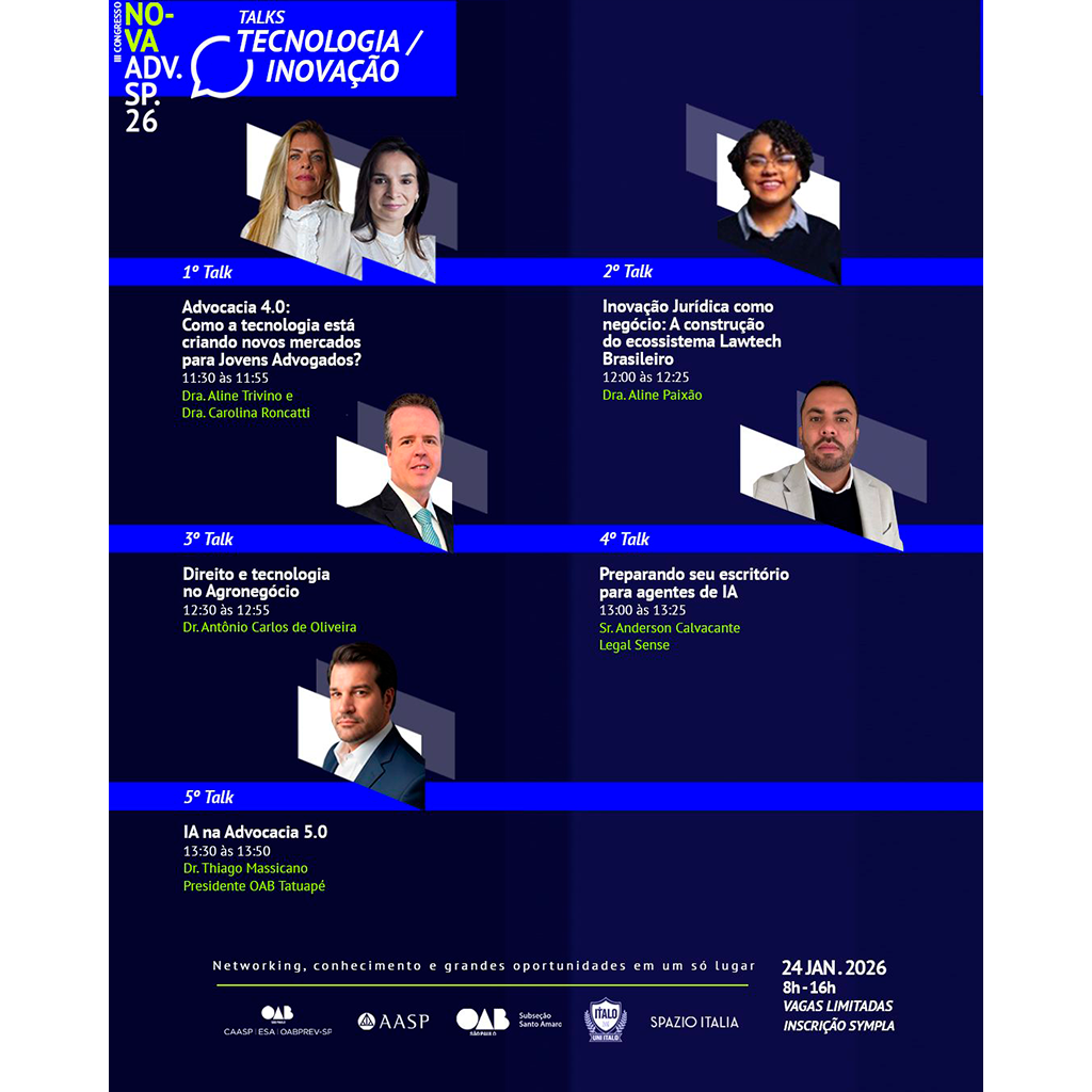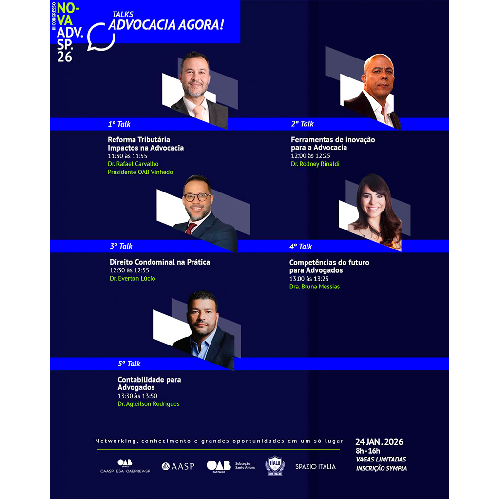 O Talks Advocacia Agora! reúne debates práticos e atuais sobre gestão, inovação, contabilidade, competências profissionais e os impactos das mudanças legislativas no exercício da advocacia.