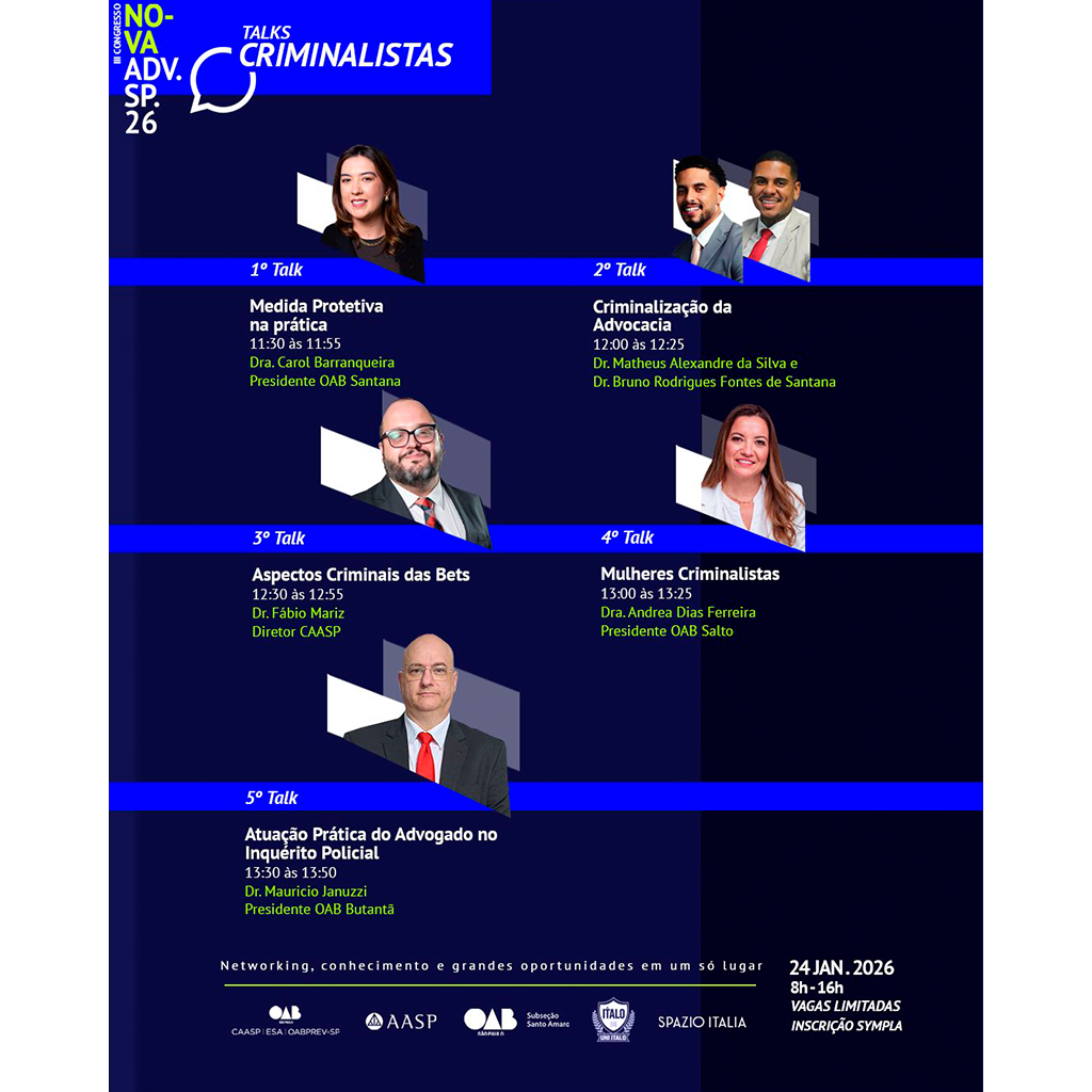 A advocacia criminal exige técnica, preparo emocional, coragem e constante atualização. O Talks Criminalistas foi pensado para debater temas essenciais da prática penal contemporânea, abordando desde a atuação cotidiana até os desafios institucionais enfrentados pela advocacia.