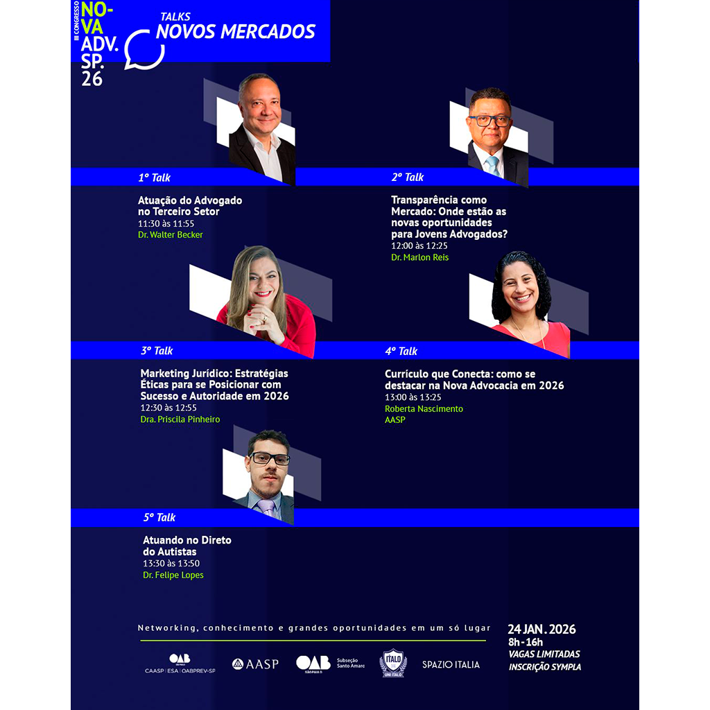 A advocacia vive um momento de expansão e diversificação de áreas de atuação. O Talks Novos Mercados foi pensado para apresentar caminhos que vão além do exercício tradicional da profissão, mostrando como o advogado pode atuar em setores estratégicos, sociais e emergentes do Direito.